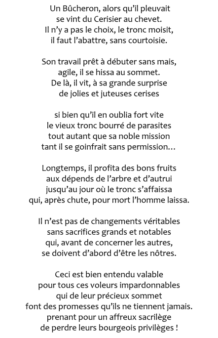 Le bûcheron et le cerisier Ou du changement Tout vrai changement nécessite des sacrifices. Ceux qui peuvent initier un changement réel sont aussi ceux qui ont le plus à perdre… Partager : Partager sur X(ouvre dans une nouvelle fenêtre) X Partager sur Facebook(ouvre dans une nouvelle fenêtre) Facebook J’aime chargement…
